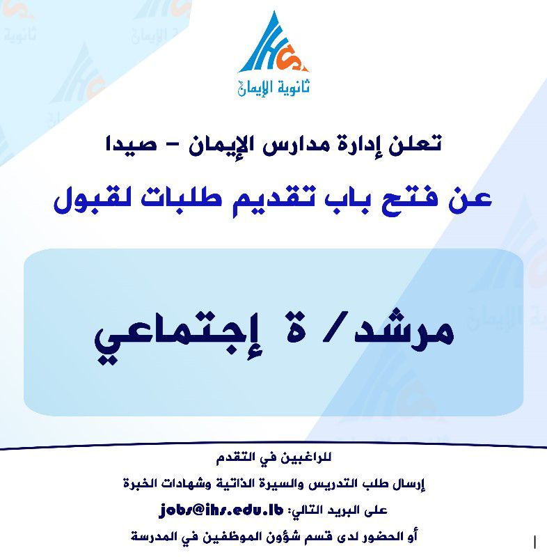 إعلان عن تقديم طلبات قبول معلمين ومعلمات ومرشد اجتماعي في ثانوية الإيمان في صيدا