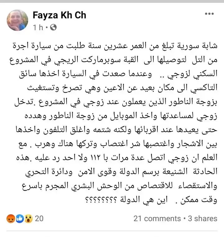 كما قالت “مع العلم ان زوجي اتصل عدة مرات با ١١٢ ولا احد رد عليه.” واختتمت المنشور بالقول “هذه الحادثة الشنيعة برسم الدولة وقوى الامن ودائرة التحري والاستقصاء للاقتصاص من الوحش البشري المجرم باسرع وقت ممكن، أين هي الدولة؟”.