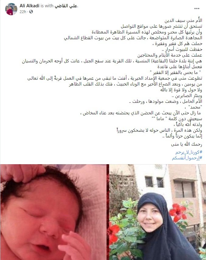 قصة حزينة ومؤثرة تُضاف إلى قصص ضحايا وباء كورونا. إنّها قصة منى سيف الدين التي رحلت بعد صراع مع كوفيد 19. هي التي وضعت مولودها محمد وفارقت الحياة.