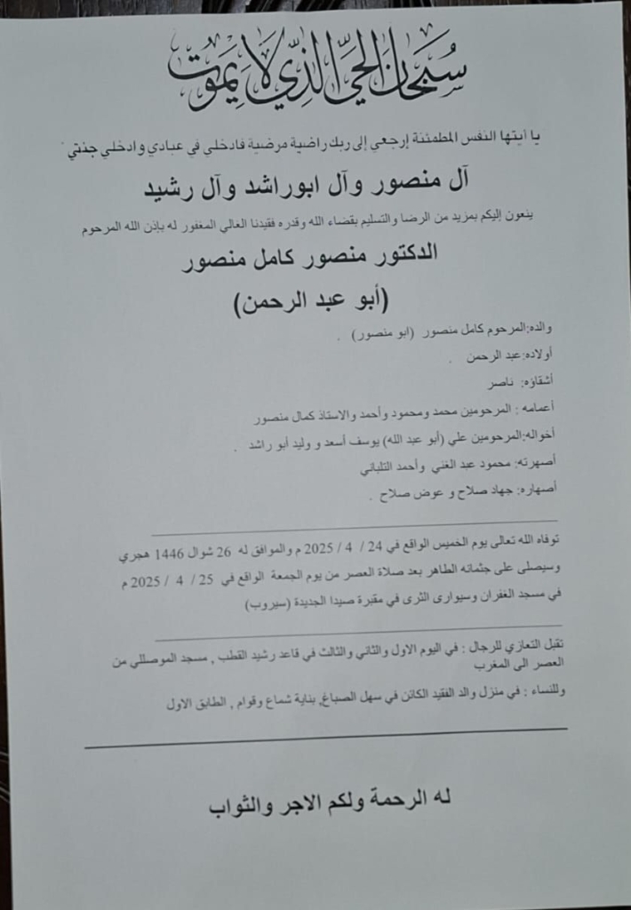 الرئيسيةUncategorized وفاة الدكتور منصور كامل منصور “أبو عبد الرحمن “ وفاة الدكتور منصور كامل منصور “أبو عبد الرحمن “ - أبريل 24, 2025 - فيUncategorized